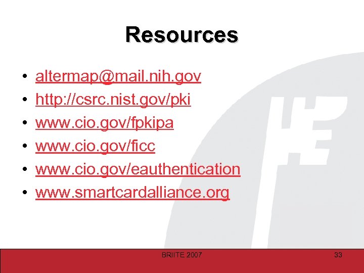 Resources • • • altermap@mail. nih. gov http: //csrc. nist. gov/pki www. cio. gov/fpkipa www. cio. gov/ficc www. cio. gov/eauthentication www. smartcardalliance. org BRIITE 2007 33