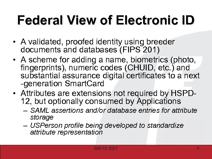 Homeland Security Presidential Directive 12 • A Presidential Mandate for Federal Agencies to issue medium hardware assurance (or better) identity credentials for access to physical and logical government resources - inside-the-firewall contractors, too – Medium Hardware or High Assurance digital certificates on PIV-2 cards (next generation Smartcards) • Fast-tracked for implementation starting 10/2006 • Led to new government standards for identity proofing and vetting (FIPS 201) and for PKI hardware tokens (NIST SP 800 - 7 x series) BRIITE 2007 4