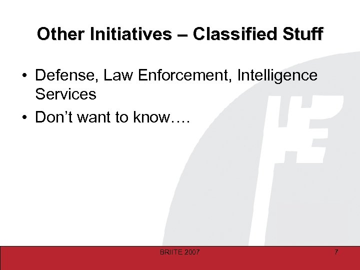 Other Initiatives – Classified Stuff • Defense, Law Enforcement, Intelligence Services • Don’t want to know…. BRIITE 2007 7