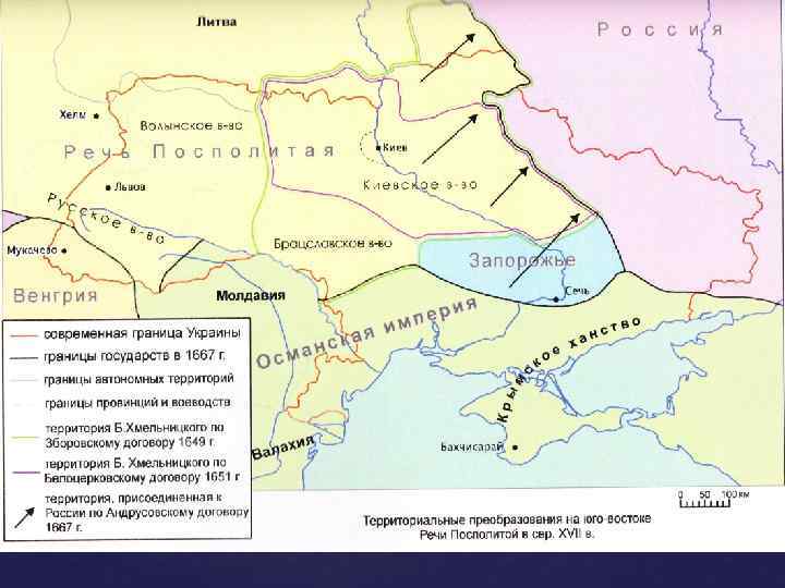 «Держава» Богдана Хмельницкого Ø 8 августа 1649 Зборовский мир, согласно которому Киевское, Черниговское и Брацлавское воеводства под контролем Хмельницкого. Ø 1650 -х политическая автономия в составе Речи Посполитой Ø 1654 г. заключение союзного договора с Москвой, согласно которому население и территория под контрольная гетману , переходила под власть царя Алексея Михайловича Ø Согласно Андрусовсскому перемирию между Россией и Речью Посполитой в 1654 г. , Москве переходили левобережные земли Киевского воеводства , остальные земли остались под польским контролем.