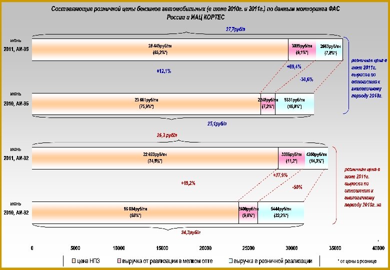 Реализация бензина АИ-92 по данным нефтяных компаний (июнь 2011 г) Конкуренция на рынках нефтепродуктов ограничена. Сбытовым компаниям, входящим в ВИНК, реализуют по ценам существенно ниже, чем для независимых АЗС, т. к. в рамках ВИНК происходит перераспределение центров доходов и затрат с розничного звена на оптовое, в связи с использованием ВИНКами трансфертного ценообразования.
