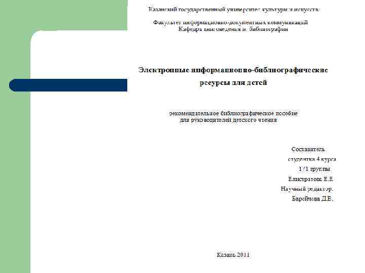 Федеральное агентство РФ Казанский государственный университет культуры и искусств Факультет информационно-документных коммуникаций Кафедра книговедения и библиографии Электронные информационнобиблиографические ресурсы для детей: методика создания рекомендательного пособия для специалистов Дипломная работа Студентки 171 гр. Елистратовой Е. Е. А кто научный руководитель? ? ? Казань 2011