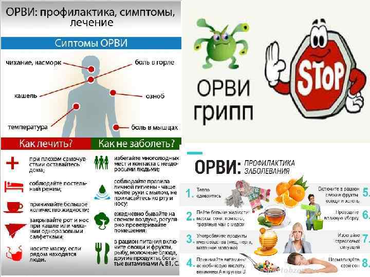 Профилактика ОРВИ Специфическая профилактика заключается в применении интерферонов в эпидемическом очаге, вакцинировании с применением наиболее распространенных штаммов гриппа в период сезонных пандемий. Для личной защиты желательно применять при контактах с больными марлевые повязки, прикрывающие нос и рот. Индивидуально также рекомендуется в качестве профилактики вирусных инфекций повышать защитные свойства организма (рациональное питание, закаливание, витаминотерапия и применение адаптогенов). В настоящее время специфическая профилактика ОРВИ не является достаточно эффективной. Поэтому необходимо уделять внимание общим мерам профилактики респираторных инфекционных заболеваний. В качестве мер общей профилактики выделяют: мероприятия направленные на контроль соблюдения санитарно-гигиенических нормативов, своевременное выявление и изоляцию больных, ограничение скученности населения в периоды эпидемий и карантинные мероприятия в очагах.