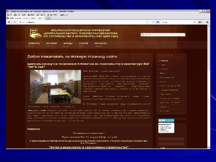 «Для развертывания научноисследовательской работы организовать…центральную архитектурную библиотеку» . (из протокола № 80 заседания Президиума Центрального Исполнительного комитета Союза ССР от 27. 10. 33 г. ). В настоящее время ФБУ «ЦНТБ Си. А» является центральной отраслевой библиотекой и обеспечивает информационное и библиотечно - библиографическое обслуживание специалистов, организаций и предприятий строительного комплекса.