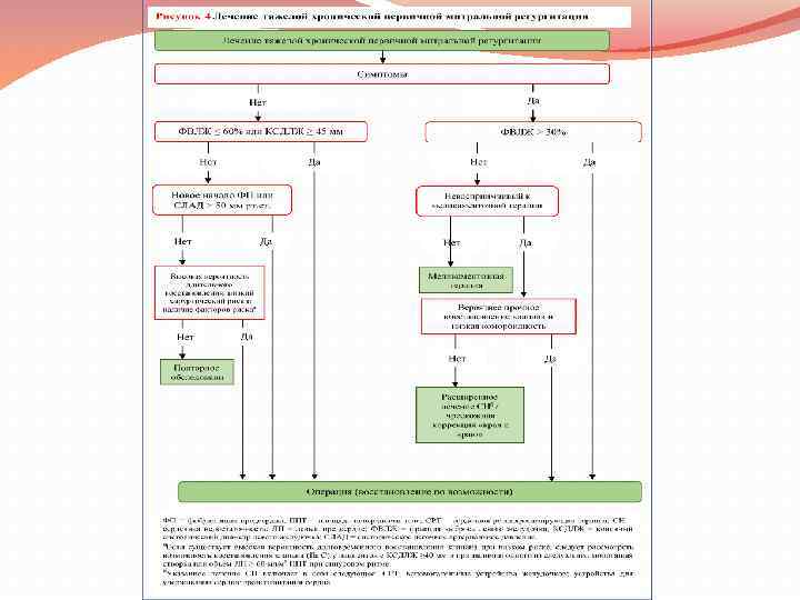 Показания к вмешательству в митральный клапан при хронической вторичной митральной регургитации Рекомендации Операция показана пациентам с тяжелой вторичной митральной регургитацией, проходящих АКШ и ФВЛЖ > 30%. Операцию следует рассматривать пациентам с симптоматикой тяжелой вторичной митральной регургитации, ФВЛЖ < 30%, но с возможностью реваскуляризации и доказательством жизнеспособности миокарда. Когда реваскуляризация не показана, операцию можно рассмотреть у пациентов с тяжелой вторичной митральной регургитацией и ФВЛЖ >30%, симптомы которых сохраняются, несмотря на медикаментозное лечение (включая СРТ, если указано), и имеют низкий хирургический риск. Когда реваскуляризация не показана, а хирургический риск невелик, можно провести чрескожное вмешательство у пациентов с тяжелой вторичной митральной регургитацией и ФВЛЖ > 30%, симптомы которых сохраняются, несмотря на медикаментозное лечение (включая СРТ, если указано), и которые имеют подходящую морфологию клапана, избегая нецелесообразности. У пациентов с тяжелой вторичной митральной регургитацией и ФВЛЖ < 30%, симптомы которых сохраняются, несмотря на оптимальное медицинское управление (включая СРТ, если указано) и у которых нет возможности для реваскуляризации, Кардиологическая бригада может рассматривать чрескожное вмешательство или операцию на клапане после тщательной оценки желудочкового вспомогательного устройства или трансплантации сердца в соответствии с индивидуальными характеристиками пациента. Класс Уровень I C IIa C IIb C