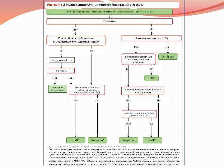 Показания к ЧМК и операции на митральном клапане при клинически значимом (умеренном или тяжелом) митральном стенозе (площадь клапана ≤ 1. 5 см 2). Рекомендации Класс Уровень ЧМК назначается пациентам с симптомами без неблагоприятных характеристик для ЧМК. I B ЧМК назначается любым пациентам с симптомами и с противопоказанием или с высоким риском для операции. I C Операция на митральном клапане показана пациентам с симптомами, которые не подходят для ЧМК. I C ЧМК следует рассматривать как начальное лечение у пациентов с симптомами субоптимальной анатомии, но не имеющих неблагоприятных клинических характеристик для ЧМК. IIa C ЧМК следует рассматривать у бессимптомных пациентов без неблагоприятных клинических и анатомических характеристик для ЧМК и высокий тромбоэмболический риск (история системной эмболии, плотный спонтанный контраст в ЛП, новоиспеченная или пароксизмальная фибрилляция предсердий); и / или высокий риск гемодинамической декомпенсации (систолическое, легочное давление > 50 мм рт. ст. в состоянии покоя, потребность в основной не кардиологической операции, желание беременности).