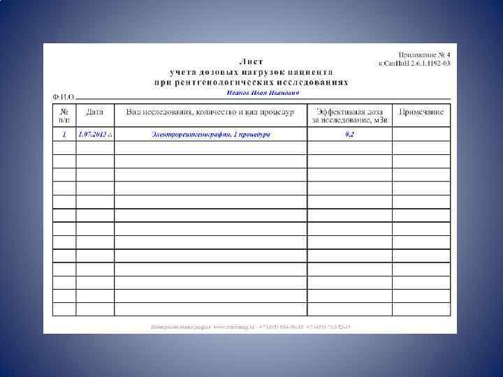 Врач-рентгенолог (или рентгенолаборант) регистрирует значение индивидуальной эффективной дозы пациента в листе учета дозовых нагрузок при проведении рентгенологических исследований (лист вклеивается в медицинскую карту амбулаторного больного или историю развития ребенка) и в журнале учета ежедневных рентгенологических исследований. При выписке больного из стационара или после рентгенологического исследования в специализированных лечебно-профилактических учреждениях значение дозовой нагрузки вносится в выписку. Впоследствии доза переносится в лист учета дозовых нагрузок медицинской карты амбулаторного больного (историю развития ребенка).