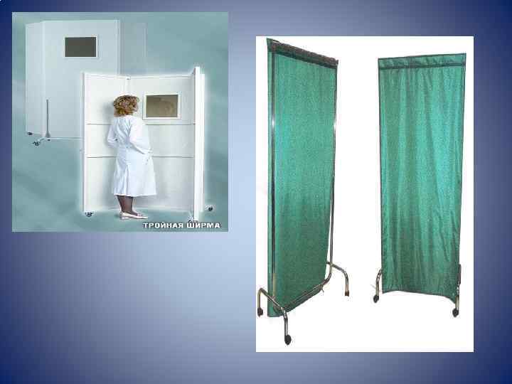 Средства радиационной защиты персонала и пациентов Передвижные · большая защитная ширма персонала (одно-, двух-, трехстворчатая) - предназначена для защиты от излучения всего тела человека; · малая защитная ширма персонала - предназначена для защиты нижней части тела человека; · малая защитная ширма пациента - предназначена для защиты нижней части тела пациента; · экран защитный поворотный - предназначен для защиты отдельных частей тела человека в положении стоя, сидя или лежа; · защитная штора - предназначена для защиты всего тела; может применяться взамен большой защитной ширмы.