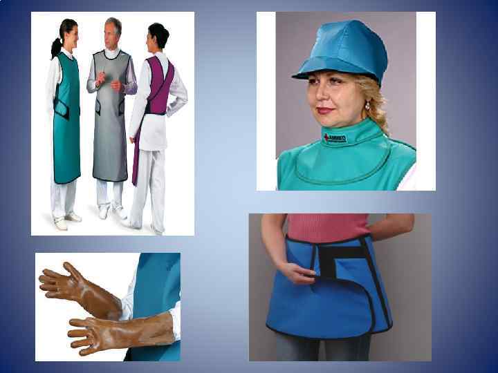 Индивидуальные · шапочка защитная · очки защитные · воротник защитный · накидка защитная, пелерина · фартук защитный односторонний тяжелый и легкий - предназначен для защиты тела спереди от горла до голеней (на 10 см ниже колен); · фартук защитный двусторонний - предназначен для защиты тела спереди от горла до голеней (на 10 см ниже колен), включая плечи и ключицы, а сзади от лопаток, включая кости таза, ягодицы, и сбоку до бедер (не менее чем на 10 см ниже пояса); · жилет защитный - предназначен для защиты спереди и сзади органов грудной клетки от плеч до поясницы; · передник для защиты гонад и костей таза - предназначен для защиты половых органов со стороны пучка излучения; · юбка защитная (тяжелая и легкая) - предназначена для защиты со всех сторон области гонад и костей таза, должна иметь длину не менее 35 см (для взрослых); · перчатки защитные - предназначены для защиты кистей рук и запястий, нижней половины предплечья; · защитные пластины (в виде наборов различной формы) - предназначены для защиты отдельных участков тела; · средства защиты мужских и женских гонад