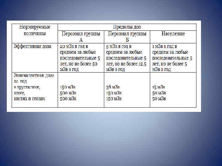 Принцип нормирования Не превышения допустимых пределов индивидуальных доз облучения граждан. Реализуется установлением гигиенических нормативов (допустимых пределов доз) облучения. Для персонала средняя годовая эффективная доза равна 20 м. Зв (0, 02 зиверта) или эффективная доза за период трудовой деятельности (50 лет) - 1000 м. Зв (1 зиверт); допустимо облучение в годовой эффективной дозе до 50 м. Зв (0, 05 зиверта) при условии, что средняя годовая эффективная доза, исчисленная за пять последовательных лет, не превысит 20 м. Зв (0, 02 зиверта). Для женщин в возрасте до 45 лет эквивалентная доза на поверхности нижней части области живота не должна превышать 1 м. Зв (0, 001 зиверта) в месяц. Для пациентов принцип нормирования не применяется (их безопасность обеспечивается применением принципов обоснования и оптимизации). Для практически здоровых лиц годовая эффективная доза при проведении профилактических медицинских рентгенологических процедур и научных исследований не должна превышать 1 м. Зв (0, 001 зиверта).