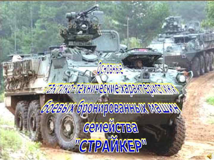 Общие черты боевых бронированных машин семейства "Страйкер" и варианты их применения RV «СТРАЙКЕР» MGS «СТРАЙКЕР» CV «СТРАЙКЕР» Разведывательная машина Командно-штабная машина NBCRV «СТРАЙКЕР» Машина РХБР MEV «СТРАЙКЕР» Высокая живучесть * Возможности модификации ** Многовариантная комплектация *** Единые принципы эксплуатации **** Универсальная система ремонта ***** Унифицированные шасси, трансмиссия, ЗИП Самоходное артиллерийское орудие MGS «СТРАЙКЕР» Машина управления огнем RSV «СТРАЙКЕР» ESV «СТРАЙКЕР» Медицинская эвакуационная машина Ремонтная машина Инженерная машина