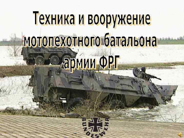 Мотопехотный батальон ФРГ Командир батальона Р Штабная и снабжения О т д е л е н и я Управления Разведыват. Транспортное Ремонтный Санитарное о т Мотопехотная (4) В з в о д ы Штаб ы Минометная Отделение управления Минометный взвод Продовольств. снабжения Запасная Отделение управления Запасный взвод (з) Отделение разведки и управления огнем Взводы мотопехотные Отделение снабжения Личный состав, чел 915 ПУ ПТУР "Милан" 16 БМП "Мардер" 53 44 -мм РПГ "Панцерфауст-1" 60 БТР М-113 18 Пистолет-пулемет МП 2 А 1 15 БТР АПН М 113 2 7, 62 -мм пулемет МГ 3 58 120 -мм самоходный миномет 10 Автомобили 78