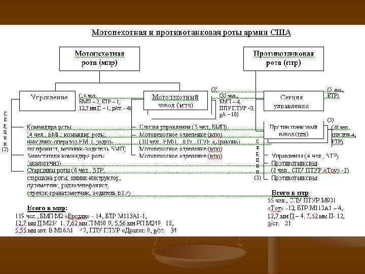 Мотопехотный батальон механизированной (бронетанковой) дивизии Командир батальона Штабная рота БМП-2 БТР-1 Штаб Разведки Оперативная Л/состава БМП-14 С Управление е роты к ц Связи и и Обеспечения Развед. Управление БМП-2 БТР-1 роты В Минометный з Мотопех. взвод в Управление роты Противотанк. взвод БМП-4 Ремонтный о д Военных священн. МТО Противотанковая рота Мотопехотная рота Секция управл. Медицинск. ы Мотопех. отд. Секция управл. ПТ отд. В мотопехотном батальоне: Л/сост чел. Штаб и шт. рота Мотопех. рота (4) ПТ рота Всего БМП М 2 Бредли БРМ М 3 Бредли БТР М 113 А 1 ПУ ПТУР "ТОУ" ПУ ПТУР Дракон 120 мм СМ М 121 12, 7 мм пулем. М 2 НВ 7, 62 мм пулем. М 60 5, 56 мм пулем. М 249 КШМ М 577 392 2 6 15 2 4 6 34 22 - 8 114 116 14 - 1 - 9 18 - - 65 - - 4 12 921 58 6 23 14 40 42 72 72 8 6 Авт. винтов М 16 А 1 720 Автомо -били 114