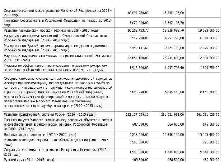1. Программа «Социальное развитие села до 2012 года» . Для развития экономического потенциала аграрного сектора и реализации приоритетного национального проекта "Развитие агропромышленного комплекса" требуется системный подход, важнейшей частью которого является осуществление мер по повышению уровня и качества жизни на селе, преодолению дефицита специалистов и квалифицированных рабочих в сельском хозяйстве и других отраслях экономики села. 2. Программа "Жилище", которая пришлась на 2002 -2010 "Жилище" годы. Успешная реализация Программы к 2010 году позволила обеспечить: - улучшение жилищных условий населения; - повышение доступности приобретения жилья. - увеличение объемов предоставления ипотечных жилищных кредитов и займов - возможность приобретения жилья, в том числе с помощью собственных средств, 3. В разделе «Развитие транспортной инфраструктуры» на данный момент действует программа "Повышение безопасности дорожного движения в 2006 -2012 годах". Проблема аварийности, связанной с автомобильным транспортом, в последнее десятилетие приобрела особую остроту в связи с несоответствием дорожно-транспортной инфраструктуры потребностям общества и государства в безопасном дорожном движении, недостаточной эффективностью функционирования системы обеспечения безопасности дорожного движения и крайне низкой дисциплиной участников дорожного движения.