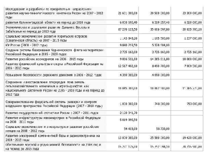 Существуют следующие основные разделы, по которым происходит определенная классификация федеральных целевых программ: • 1. Развитие социальной инфраструктуры. • 2. Развитие транспортной инфраструктуры. • 3. Новое поколение. • 4. Безопасность и экология. • 5. Развитие науки и технологий. • 6. Развитие регионов. • 7. Развитие государственных институтов.