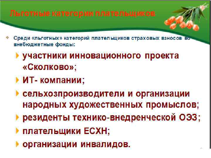 Страховые тарифы для начисления взносов в 2013 году. Пенсионный фонд 1967 г. и моложе Категории плательщиков ФСС ФФОМС Итого Накопительная Страховая часть 22. 0 16. 0 Основной тариф До предельной из них: 2. 9 5. 1 30. 0 - индивидуальная (применяются всеми величины (568000) 6. 0 -солидарная часть 6. 0 –солидарная часть организациями, если для них 16. 0 - индивидуальная часть 10. 0 - индивидуальная не установлен иной Свыше предельной пониженный тариф) (ст. 58. 2) 10. 0 -солидарная 0. 0 10. 0 величины (568000) Сельхозпредприятия, плательщики ЕСХН, инвалиды (ст. 58 ч. 1 п. 1 -3) Научные, техниковнедренческие, ИТпредприятия (ст. 58 ч. 1 п. 4 -6) 1966 г. и старше До предельной 16. 0 -индивидуальная величины (568000) часть 10. 0 -индивидуальная 6. 0 - часть индивидуальная 1. 9 2. 3 20. 2 До предельной 8. 0 величины (568000) -индивидуальная часть 2. 0 6. 0 - -индивидуальная часть индивидуальная 2. 0 4. 0 14. 0 8. 0 -индивидуальная 6. 0 - индивидуальная; 0. 0 14. 0 20. 8 из них: 4. 8 -солидарная часть; 16. 0 - индивидуальная часть; 14. 8 из них: 6. 0 - 4. 8 -солидарная часть индивидуальная 10. 0 - индивидуальная часть; 2. 9 3. 3 27. 0 20. 0 из них: 4. 0 -солидарная часть; 16. 0 - индивидуальная; 14. 0 из них: 4. 0 -солидарная часть 10. 0 - индивидуальная 0. 0 20. 0 2. 9 5. 1 30. 0 Участники проекта Сколково До предельной 14. 0 (ст. 58. 1) величины (568000) -индивидуальная СМИ (телевидение, радиовещание, издательская, полиграфическая До предельной деятельность) (за искл. величины (568000) реклама и эротика) (ст. 58 ч. 1 п. 7) Малый бизнес, организации на УСНО (производство и До предельной соц. сфера) (ст. 58 ч. 1 п. 8, 10 - величины (568000) 12) До предельной Экипаж судов (ст. 58 ч. 1 п. 9) величины (568000) Инжиринговые компании (ст. 58 ч. 1 п. 13) 22. 0 До предельной из них: величины (568000) 6. 0 -солидарная часть 16. 0 - индивидуальная 0. 0 6. 0 - индивидуальная часть тарифа страховых взносов; 0. 0 16. 0 из них: - индивидуальная 6. 0 –солидарная часть ; 10. 0 - индивидуальная