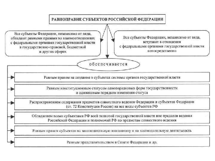 4)Равноправие субъектов Российской Федерации Это равноправие прежде всего проявляется: • в равенстве их прав и обязанностей как субъектов федерации • в конституционно установленных равных пределах компетенции субъектов всех видов, в одинаковой степени ограниченной компетенцией самой Российской Федерации • в равном представительстве всех субъектов в Совете Федерации