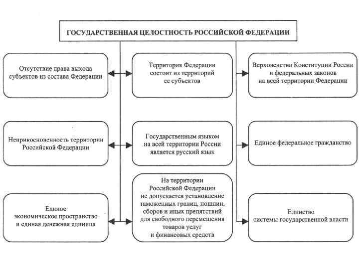 1) Государственная целостность Российская Федерация — цельное, единое и нераздельное, хотя и федеративное, государство, включающее другие государства и государственные образования