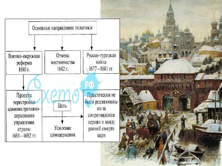 Внутренняя политика. объявленный престолонаследником после кончины старшего брата Алексея, был очень слаб и болезнен, как и все сыновья Алексея Михайловича от Марии Милославской, с детства страдал «скорбутом» (цингой). Вступил на царский престол в четырнадцать лет. В первые месяцы царствования Федор Алексеевич тяжело болел и фактическими правителями государства были А. С. Матвеев, патриарх Иоаким и И. М. Милославский. Однако уже к середине 1676 г. царь взял власть в свои руки, после чего Матвеев был отправлен в ссылку.