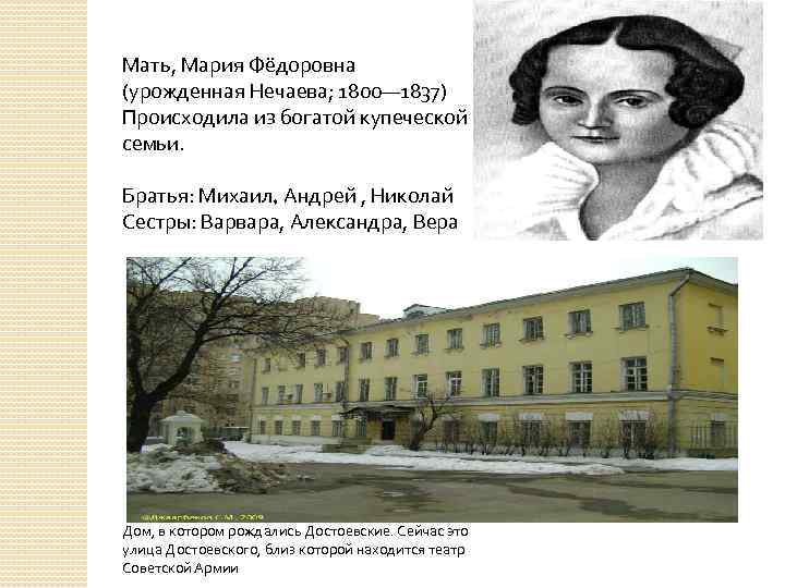 Мать, Мария Фёдоровна (урожденная Нечаева; 1800— 1837) Происходила из богатой купеческой семьи. Братья: Михаил, Андрей , Николай Сестры: Варвара, Александра, Вера Дом, в котором рождались Достоевские. Сейчас это улица Достоевского, близ которой находится театр Советской Армии