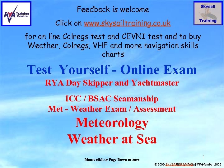 Feedback is welcome Skysail Click on www. skysailtraining. co. uk Training for on line Colregs test and CEVNI test and to buy Weather, Colregs, VHF and more navigation skills charts Test Yourself - Online Exam RYA Day Skipper and Yachtmaster ICC / BSAC Seamanship Met - Weather Exam / Assessment Meteorology Weather at Sea Mouse click or Page Down to start 1 © 2009 SKYSAILTRAINING 9 th November 2009 © K M Bater 2010