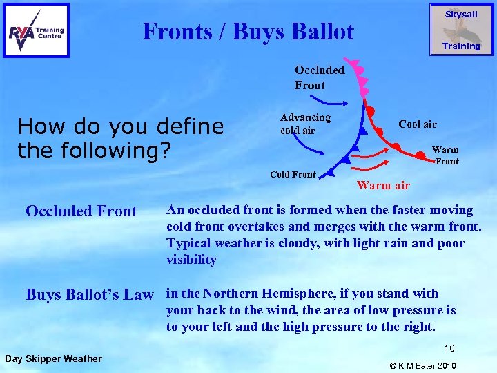 Skysail Fronts / Buys Ballot Training Occluded Front How do you define the following? Advancing cold air Warm Front Cold Front Occluded Front Cool air Warm air An occluded front is formed when the faster moving cold front overtakes and merges with the warm front. Typical weather is cloudy, with light rain and poor visibility Buys Ballot’s Law in the Northern Hemisphere, if you stand with your back to the wind, the area of low pressure is to your left and the high pressure to the right. Day Skipper Weather 10 © K M Bater 2010