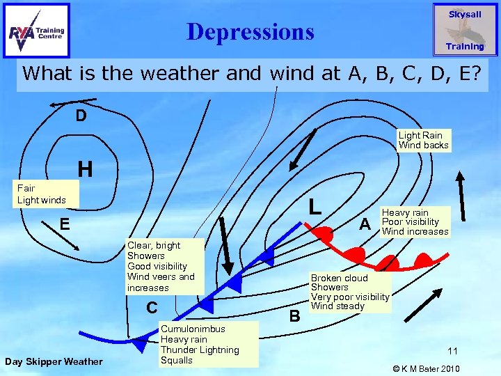 Skysail Depressions Training What is the weather and wind at A, B, C, D, E? D Light Rain Wind backs H Fair Light winds L E Clear, bright Showers Good visibility Wind veers and increases C Day Skipper Weather Cumulonimbus Heavy rain Thunder Lightning Squalls B A Heavy rain Poor visibility Wind increases Broken cloud Showers Very poor visibility Wind steady 11 © K M Bater 2010