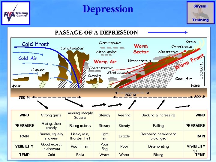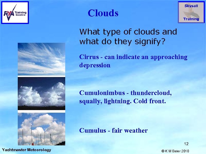 Skysail Clouds Training What type of clouds and what do they signify? Cirrus - can indicate an approaching depression Cumulonimbus - thundercloud, squally, lightning. Cold front. Cumulus - fair weather 12 Yachtmaster Meteorology © K M Bater 2010