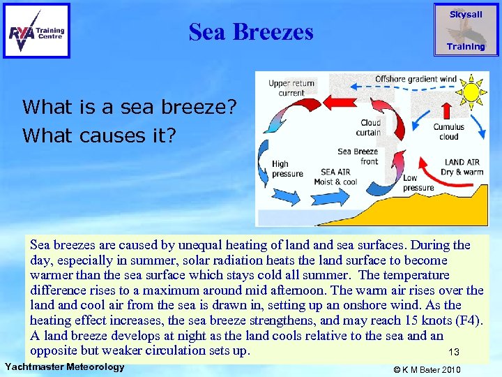 Sea Breezes Skysail Training What is a sea breeze? What causes it? Sea breezes are caused by unequal heating of land sea surfaces. During the day, especially in summer, solar radiation heats the land surface to become warmer than the sea surface which stays cold all summer. The temperature difference rises to a maximum around mid afternoon. The warm air rises over the land cool air from the sea is drawn in, setting up an onshore wind. As the heating effect increases, the sea breeze strengthens, and may reach 15 knots (F 4). A land breeze develops at night as the land cools relative to the sea and an opposite but weaker circulation sets up. 13 Yachtmaster Meteorology © K M Bater 2010