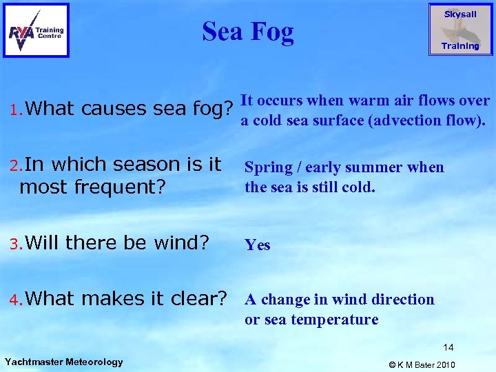 Skysail Sea Fog 1. What causes sea fog? 2. In which season is it most frequent? 3. Will there be wind? 4. What Training It occurs when warm air flows over a cold sea surface (advection flow). Spring / early summer when the sea is still cold. Yes makes it clear? A change in wind direction or sea temperature 14 Yachtmaster Meteorology © K M Bater 2010