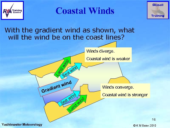 Skysail Coastal Winds Training With the gradient wind as shown, what will the wind be on the coast lines? Winds diverge. La n dw ind Coastal wind is weaker a Se ind w d win nt e radi G a Se ind w nd La Winds converge. d in w Coastal wind is stronger 16 Yachtmaster Meteorology © K M Bater 2010