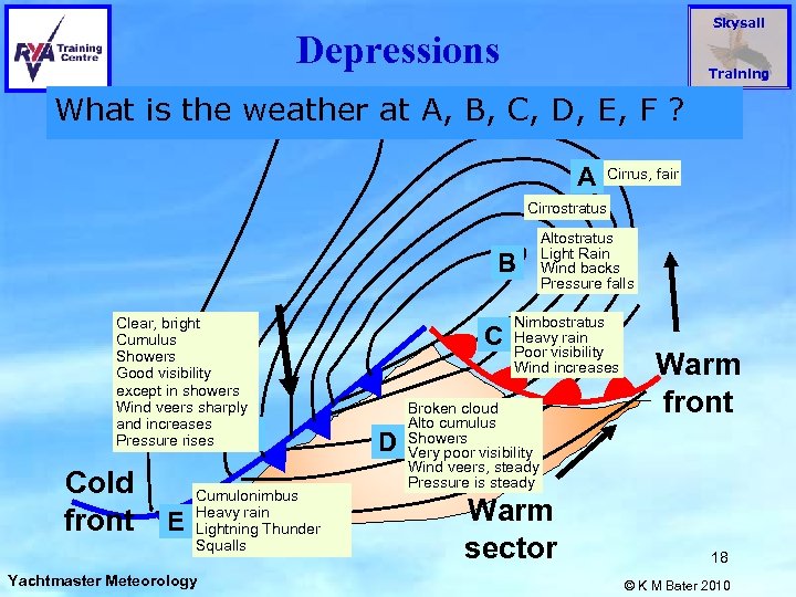 Skysail Depressions Training What is the weather at A, B, C, D, E, F ? A Cirrus, fair Cirrostratus B Clear, bright Cumulus Showers Good visibility except in showers Wind veers sharply and increases Pressure rises F Cold front E Cumulonimbus Heavy rain Lightning Thunder Squalls Yachtmaster Meteorology C D Altostratus Light Rain Wind backs Pressure falls Nimbostratus Heavy rain Poor visibility Wind increases Broken cloud Alto cumulus Showers Very poor visibility Wind veers, steady Pressure is steady Warm sector Warm front 18 © K M Bater 2010