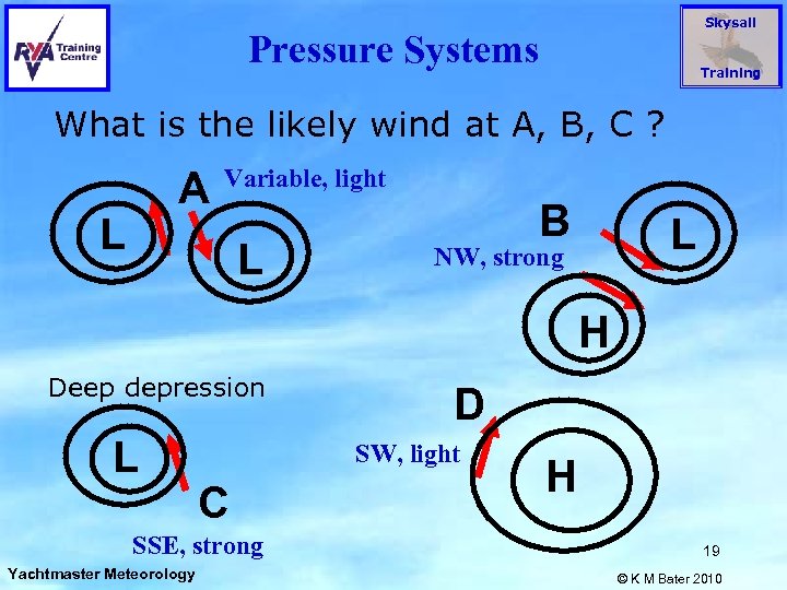 Skysail Pressure Systems Training What is the likely wind at A, B, C ? A L Variable, light L B L NW, strong H Deep depression L SW, light C SSE, strong Yachtmaster Meteorology D H 19 © K M Bater 2010