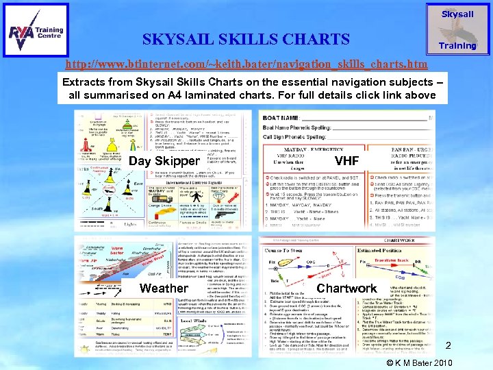 Skysail SKYSAIL SKILLS CHARTS Training http: //www. btinternet. com/~keith. bater/navigation_skills_charts. htm Extracts from Skysail Skills Charts on the essential navigation subjects – all summarised on A 4 laminated charts. For full details click link above Day Skipper VHF Weather Chartwork 2 © K M Bater 2010