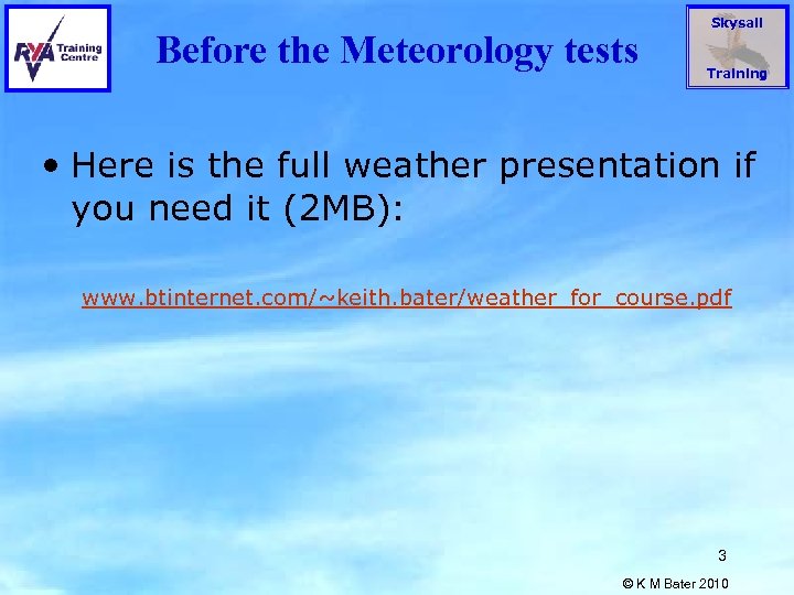 Before the Meteorology tests Skysail Training • Here is the full weather presentation if you need it (2 MB): www. btinternet. com/~keith. bater/weather_for_course. pdf 3 © K M Bater 2010