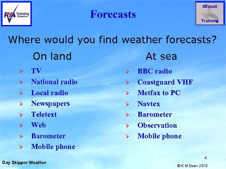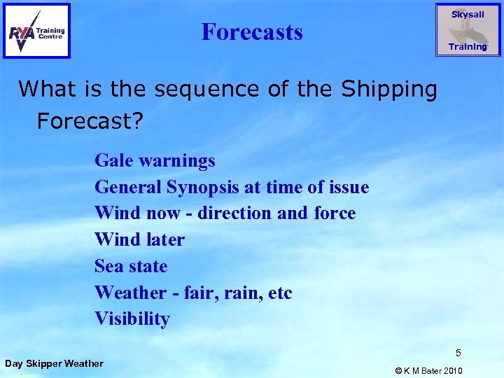 Skysail Forecasts Training What is the sequence of the Shipping Forecast? Gale warnings General Synopsis at time of issue Wind now - direction and force Wind later Sea state Weather - fair, rain, etc Visibility Day Skipper Weather 5 © K M Bater 2010