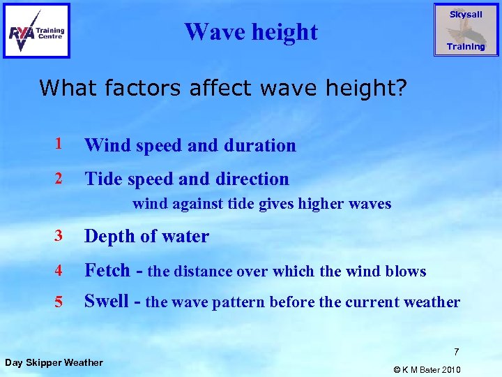 Skysail Wave height Training What factors affect wave height? 1 Wind speed and duration 2 Tide speed and direction wind against tide gives higher waves 3 Depth of water 4 Fetch - the distance over which the wind blows 5 Swell - the wave pattern before the current weather Day Skipper Weather 7 © K M Bater 2010