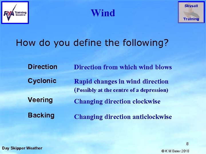 Skysail Wind Training How do you define the following? Direction from which wind blows Cyclonic Rapid changes in wind direction (Possibly at the centre of a depression) Veering Changing direction clockwise Backing Changing direction anticlockwise Day Skipper Weather 8 © K M Bater 2010