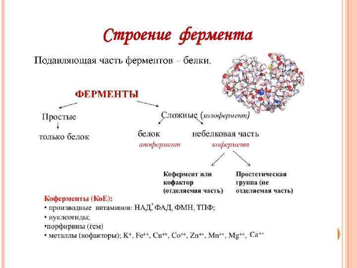 Апофермент белковый компонент сложных ферментов, определяет субстратную специфичность, участвует в регуляции каталитической активности. Активный центр фермента — участок поверхности молекулы фермента, непосредственно взаимодействующий с молекулой субстрата. Образован из остатков аминокислот, находящихся в составе различных участков полипептидной цепи или различных полипептидных цепей, пространственно сближенных. Возникает на уровне третичной структуры белка фермента.