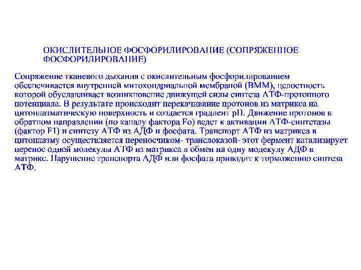 • • • • • ГРУППА СОЕДИНЕНИЙ, ВЛИЯЮЩИХ НА ОКИСЛИТЕЛЬНОЕ ФОСФОРИЛИРОВАНИЕ. 1) ингибиторы дегидрогеназ 2) ингибиторы дыхания 3) разобщители окислительного фосфорилирования 4) ингибиторы фосфорилирования 1. Ингибиторы дегидрогеназ. Действие выражается в препятствовании окислению субстратов, чем снижается выделение водорода в дыхательную цепь: производные NAD, FAD; - тяжелые металлы и мышьяк (III) (блокирование SH- групп дегидрогеназ); - малонат- конкурент сукцинатдегидрогеназы. 2. Блокирование звеньев образования протонного потенциала (барбамил, ротенон). а) Прерывают поступление Н от NADH, т. е. от субстратов, окисляющихся NAD- зависимыми дегидрогеназами (возможно, и FADзависимыми). б) CN-, азиды, СО- блокируют цитохромоксидазы, передачу водорода на кислород. Возникает ситуация кислородного голодания, хотя кислород наличествует в избытке. Выключается протонный градиент и связанное с ним фосфорилирование. Наступает энергетический голод и прекращается жизнедеятельность. (ПРИМЕР- ядовитость KCN). 3. Разобщители окислительного фосфорилирования. Способствуют перетоку протонов в обход АТФ-синтетазы, что прекращает фосфорилирование, а идет только одно дыхание (с выделением тепла). а) протонофоры б) ионофоры а) R-COO- + H+ ->R-COOH ->(мембрана) -> R-COO- + H+ б) полипептидные антибиотики- создают дыры в мембране, проходимые для ионов и протонов. Грамицидин А вызывает гибель аэробных микроорганизмов, нарушая проницаемость их клеточной мембраны и разобщая дыхание и фосфорилирование, которое у них идет в клетке, а не в митохондриях, как у млекопитающих. 4. Ингибиторы фосфорилирования (олигомицин). Нарушают проток протонов по каналу Fo, одновременно ингибируя синтез АТФ в активном центре F 1. Фосфорилирование прекращается, а с ним прекращается и дыхание. ПРОТОНОФОРЫ снимают угнетающее влияние ингибиторов на дыхание, хотя фосфорилирование остается подавленным.