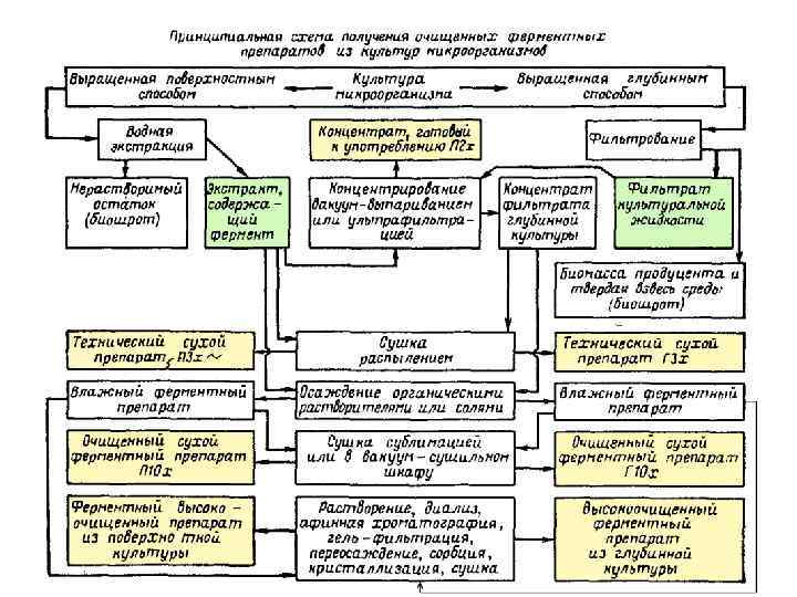 ФП имеют разную степень концентрирования и очистки: х, 3 х-Ф, 10 х, 20 х, 25 х (дорогие). Гх: неочищенная культурная жидкость. Г 3 х: имеют ферментативную активность в 3 раза выше, чем Гх. Получены путем распылительной сушки концентрированной культуральной жидкости. Концентрируют вакуум-выпариванием при 30˚С с добавлением стабилизаторов (Na. Cl). Это тоже "грязные" ФП (1010 спор/г). Г 3 х-Ф: культуральную жидкость фильтруют, концентрируют, сушат. Это частично очищенные ФП, так как удалена биомасса, активность выше, чем у Г 3 х. Г 10 х: обрабатывают коагулянтами культуральную жидкость, фильтруют, концентрируют, осаждают ферменты органическими растворителями, ферментный осадок отделяют от жидкой фазы и высушивают. Г 20 х: для получения используют ультрафильтрацию, остальное - как в Г 10 х. Пх: получают высушиванием культуры грибов, "грязные", аналогичны Г 3 х. П 10 х, П 25 х: водная экстракция ферментов, отделение экстракта; осаждение органических соединений; отделение осадка в Н 2 О, добавление стабилизатора и наполнителя, сушка.