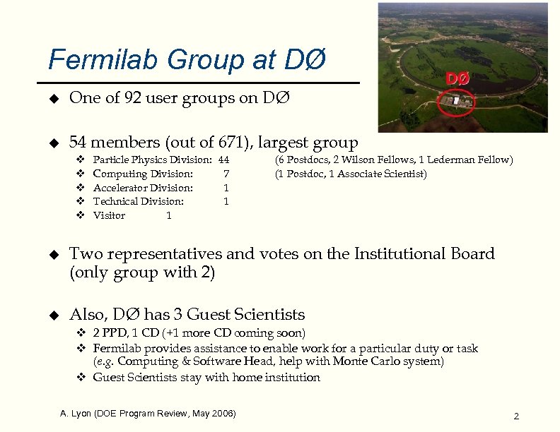 Fermilab Roles in DØ Physics u u Adam Lyon for the DØ Fermilab Group May 2006 Outline u Introduction to the Fermilab Group at DØ u Highlight Fermilab’s role in. . . v. DØ Organization v. Support for Physics Analyses v. The DØ Physics Program
