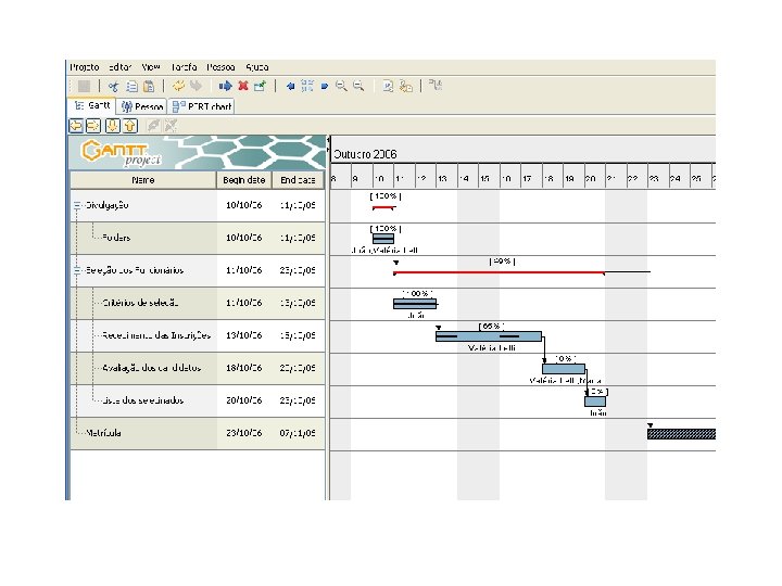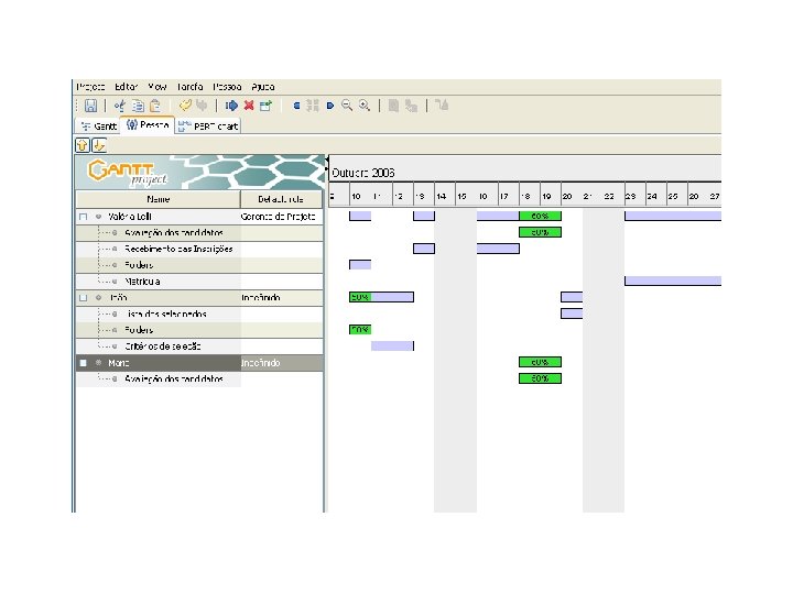 Ganttproject Funcionalidades: § Foca o cronograma § Gráficos de Gantt, PERT e Alocação de Recursos. § Lista de contatos § Exporta arquivos para os formatos html, jpg, png, pdf e para ferramenta Microsoft Project