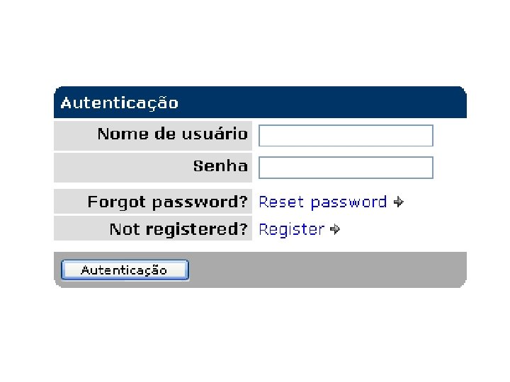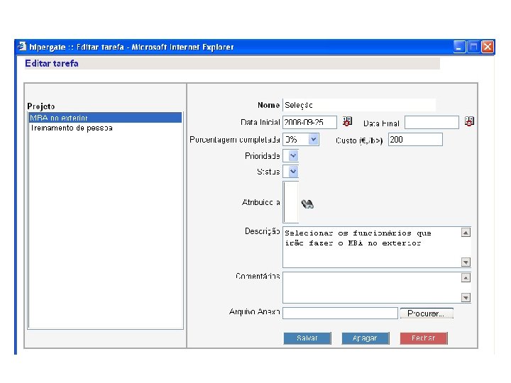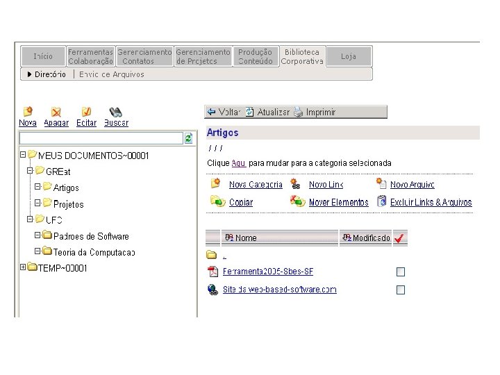 Outras características § Notificação via e-mail § Visualização do cronograma dos projetos através de Gráficos de Gantt § Lista de contatos § Fórum de discussão § Bug Report § Base de lições aprendidas