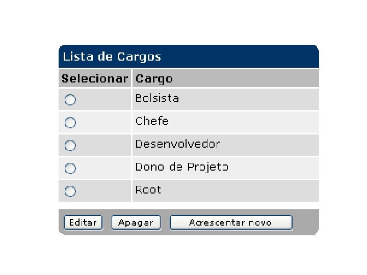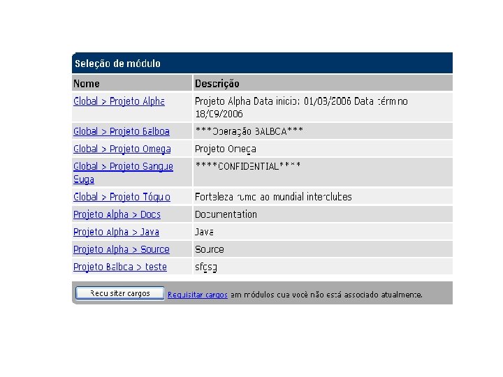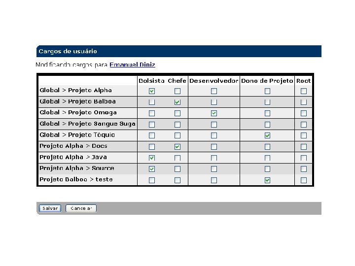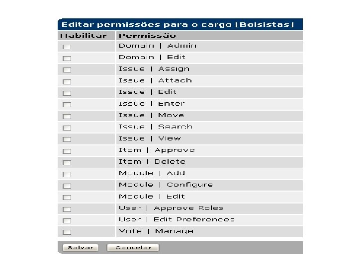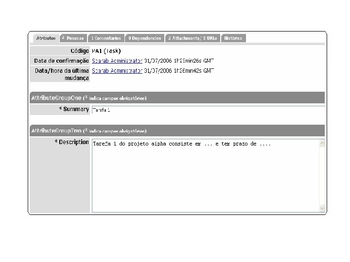 SCARAB Funcionalidades: § Boa documentação § Usa módulo ao invés de projeto. Cada módulo contém: um conjunto de permissões por cargo e por tipo de item. § Cada tarefa: atributos, pessoas, comentários, dependências, anexos/URL e histórico. § Excelente gerenciamento de acesso.