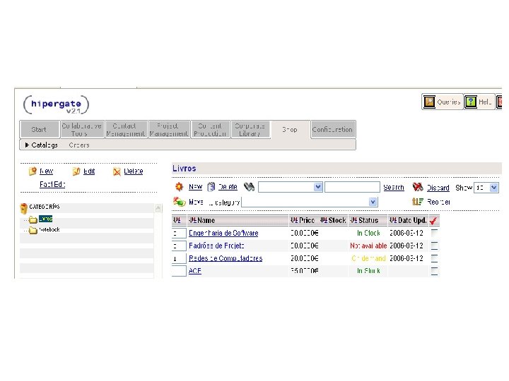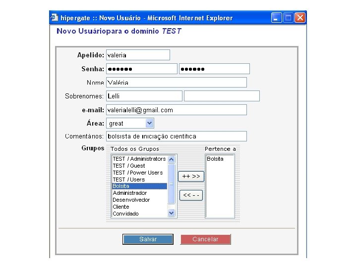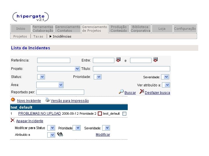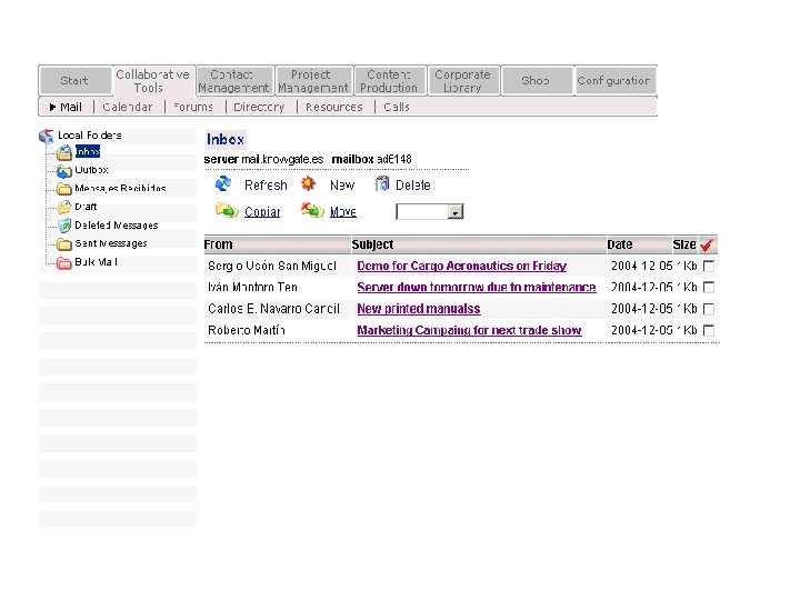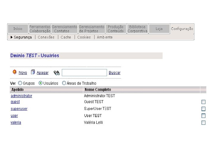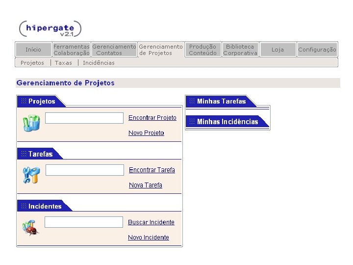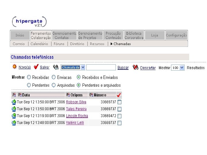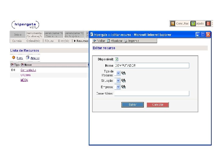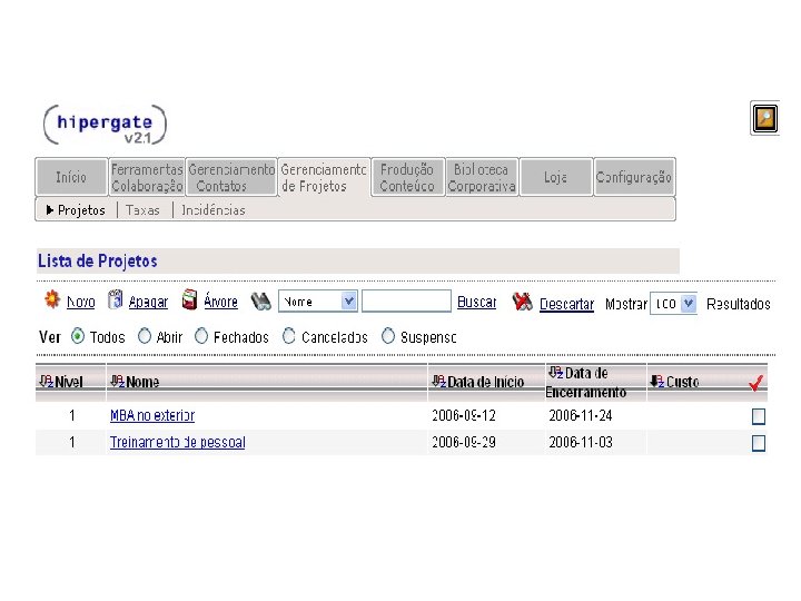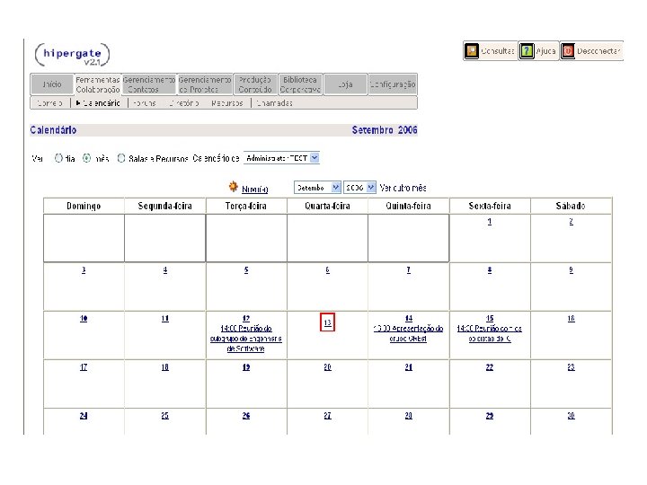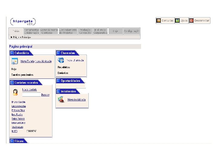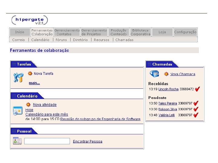 HIPERGATE Funcionalidades: § Ambiente Multiprojetos § Permissões de acesso é feita através de grupos e áreas de trabalho § Na aba “Ferramentas Colaboração” estão reunidas as principais funcionalidades do Hipergate, tais como: Mail, Calendário, Fórum, Diretório, Recursos e Chamadas.