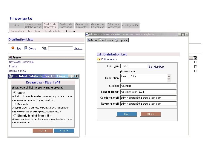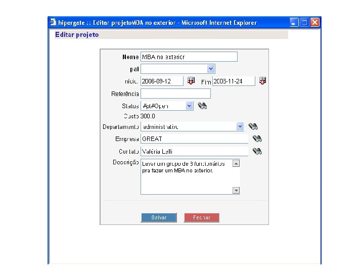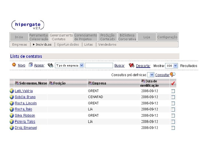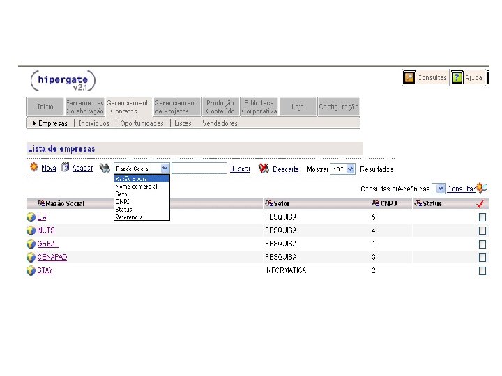 HIPERGATE Características: § Ferramenta livre § Código aberto (Licença HGPL – Hipergate General Public License) § Multiplataforma § Desenvolvida em java § Banco de dados: Microsoft Server SQL, Oracle e Postgre. SQL