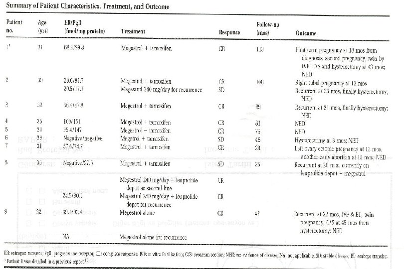 Preserving Fertility in Endometrial Cancer Inclusion Criteria Ø Ø Ø Age < 40 years Nulliparous status Endometrioid Carcinoma G 1 Presence of Pg. R Normal serum levels of CA 125 (<35 u/m. L) and CEA (< 5 ng/m. L) Ø Tumor DNA index < 1. 3 Ø Absence of MI or extrauterine spread (by vaginal USG and MRI) , surgıcal staging