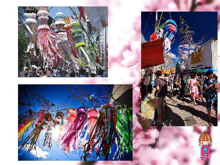 In all cities tanabat's celebration happens differently. But the general tradition fireworks, parades, festive registration of persons. One more remarkable tradition – custom hang on bamboo branches of color paper with desires or names of the beloved written on them. Many girls at night of tanabata pray for a happy marriage Во всех городах празднование Танабата происходит по-разному. Но общая традиция - фейерверк, парады, праздничное оформление лиц. Еще одна замечательная традиция - обычай, развешивать на ветвях бамбука цветную бумагу с желаниями или именами возлюбленного, написанного на них. Много девочек в ночь Танабаты молятся о счастливом замужестве