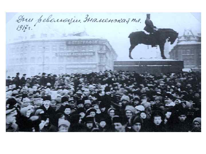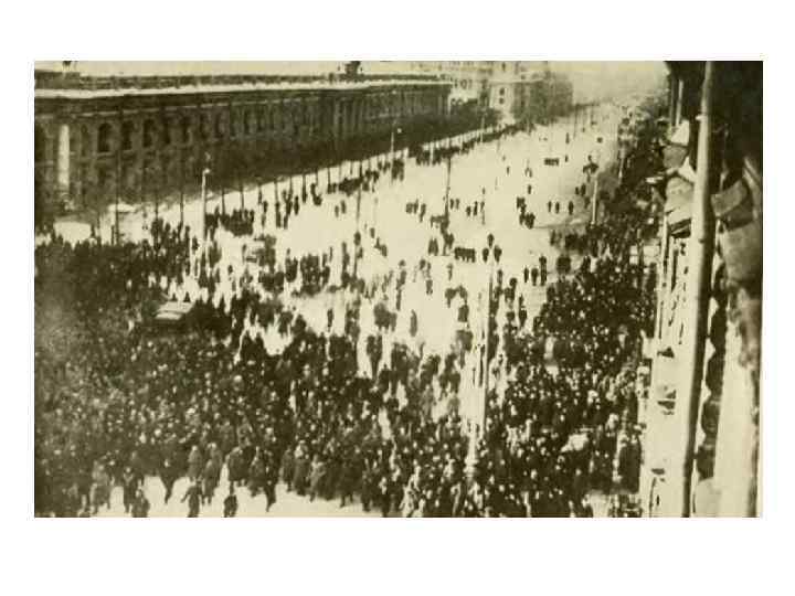 • Февральская революция началась как стихийный порыв народных масс, однако её успеху способствовал и острый политический кризис в верхах, резкое недовольство либеральнобуржуазных кругов самодержавной политикой царя. • Хлебные бунты, антивоенные митинги, демонстрации, стачки на промышленных предприятиях города наложились на недовольство и брожение среди многотысячного столичного гарнизона, присоединившегося к вышедшим на улицы революционным массам.
